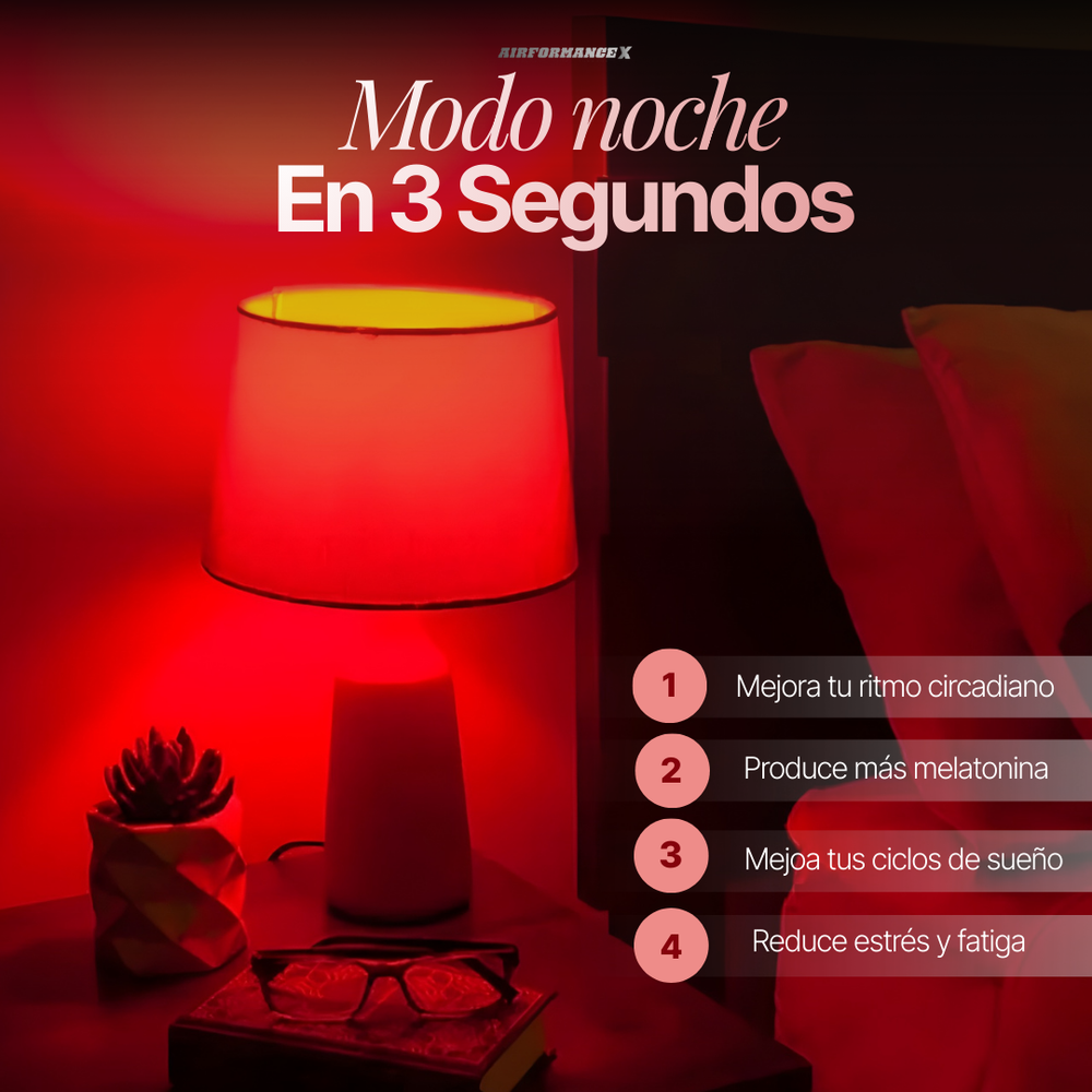 La mayoría de hogares utilizan iluminación LED blanca, que suprime la melatonina y mantiene el cerebro en estado de alerta. AirGlow™ elimina ese estímulo y crea un entorno lumínico adecuado para descansar y para la reparación nocturna.