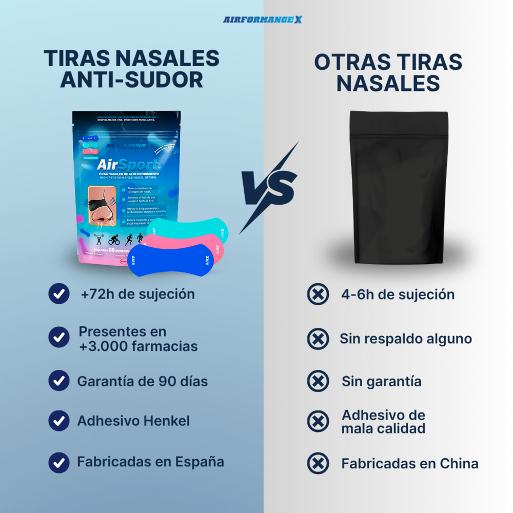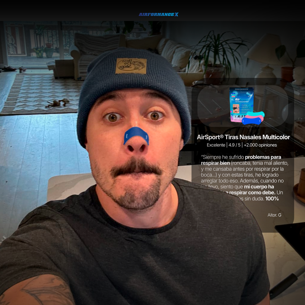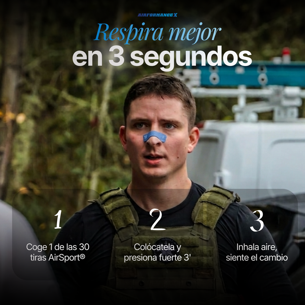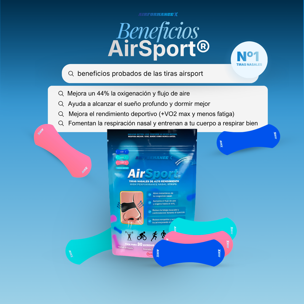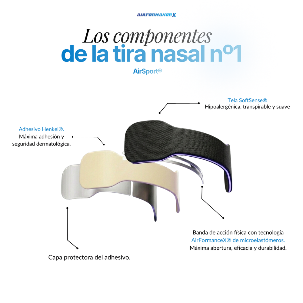 AirSport® utiliza una arquitectura de micro-elastómeros desarrollada por AirFormance X®. Hasta un +44% de apertura nasal, frente al ~30% de las tiras estándar del mercado.