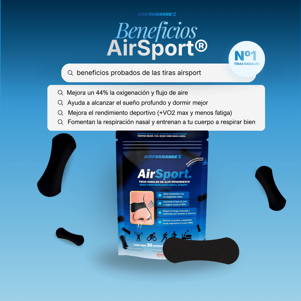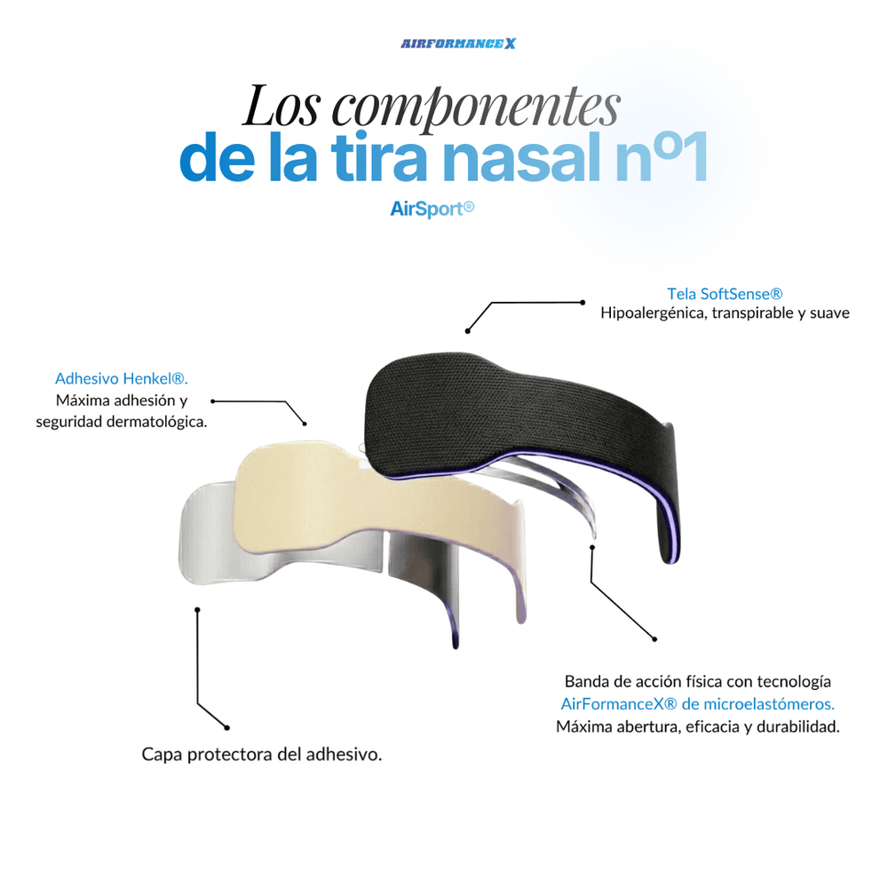 AirSport® es la tira nasal de alto rendimiento que te ofrece máxima comodidad, ajuste seguro y mayor oxigenación tanto de día como de noche, para que respires mejor y rindas al máximo.